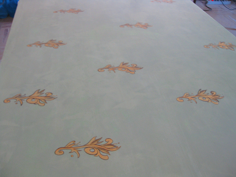 Hand painted Medieval Italian motif over Venetian stucco. Buffed wax finish.